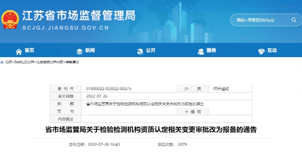 近日,江蘇省市監(jiān)局發(fā)布“關(guān)于檢驗(yàn)檢測機(jī)構(gòu)資質(zhì)認(rèn)定相關(guān)變更審批改為報備的通告”,自2022年7月27日正式執(zhí)行。江蘇省市監(jiān)局將檢驗(yàn)檢測機(jī)構(gòu)申請無需現(xiàn)場確認(rèn)的機(jī)構(gòu)法定代表人、最高管理者、技術(shù)負(fù)責(zé)人、授權(quán)簽字人變更,以及無實(shí)質(zhì)變化的標(biāo)準(zhǔn)變更審批改為報備。檢驗(yàn)檢測機(jī)構(gòu)須以自我聲明符合資質(zhì)認(rèn)定相關(guān)要求的方式向市監(jiān)局備案。各檢驗(yàn)檢測機(jī)構(gòu):為了深入貫徹“放管服”改革要求,認(rèn)真落實(shí)“證照分離”工作部署,進(jìn)一步推進(jìn)檢驗(yàn)檢測機(jī)構(gòu)資質(zhì)認(rèn)定改革,優(yōu)化檢驗(yàn)檢測機(jī)構(gòu)準(zhǔn)入服務(wù),根據(jù)《市...